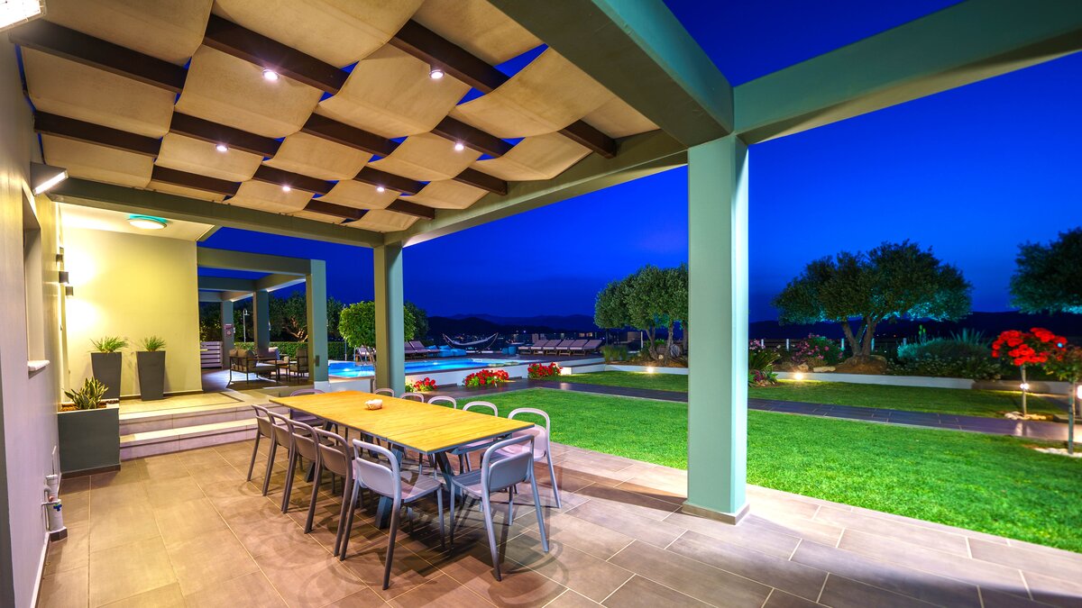 Treten Sie nach draußen, um eine private Oase für Freizeit und Unterhaltung zu entdecken. Der gepflegte Garten der Villa verfügt über einen beheizten 12-Meter-Pool, ein separates Kinderbecken und viele Liegestühle, auf denen Sie die kretische Sonne genießen können. Eine schattige Pergola beherbergt einen Essbereich im Freien und einen eingebauten Grill, der sich perfekt für abendliche Zusammenkünfte eignet. Kinder können sich auf dem Spielplatz vergnügen, während die Erwachsenen eine Partie Tischtennis spielen oder einfach in der Hängematte entspannen können, alles vor dem Hintergrund der wunderschönen Natur.