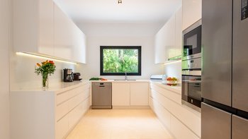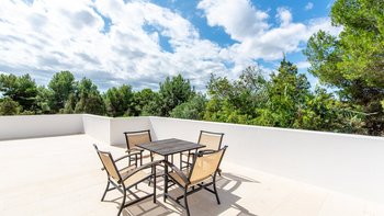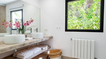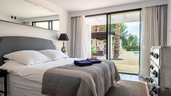 Die Liebe zum Detail macht dieses Haus zu einem sehr angenehmen, komplett renovierten Zuhause; Die Schlafzimmer und Bäder sind alle neu und außergewöhnlich groß für Ibiza-Verhältnisse. Deren Küche, die ebenfalls brandneu ist, ist mit allem ausgestattet, um jeden Tag für kleine und große Gruppen kochen zu können. Es gibt insgesamt 3 Wohnzimmerbereiche im Haus, so dass es auch für große Gruppen sehr einfach ist, Privatsphäre zu finden oder Zeit miteinander zu verbringen. Der Haupthaus hat zwei Stockwerke. Im sehr hellen Erdgeschoss befindet sich die Küche mit einem angeschlossenen großen Essbereich, 2 Wohnzimmer mit Sofas, die Platz für 10 Personen bieten. Einer von ihnen ist auch mit einem Smart-TV ausgestattet. Auf der anderen Seite des Wohnzimmers befindet sich ein großes Schlafzimmer mit separatem Bad, das eine Badewanne und eine ebenerdige Dusche bietet. Im ersten Stock befindet sich ein weiteres Wohnzimmer – mit einem herrlichen Blick auf das Anwesen und Ibiza-Stadt mit dem Schloss von Ibiza im Hintergrund. An einem klaren Tag kann man sogar Formentera sehen. Auf der linken Seite gelangt man in ein großes Schlafzimmer mit eigenem Bad, mit Badewanne und separater Dusch- und begehbarem Kleiderschrank. Auf der rechten Seite befinden sich zwei weitere Schlafzimmer mit eigenem Bad, jeweils mit begehbaren Duschen. Beiden Schlafzimmer teilen sich eine große Terrasse, die mit einem motorisierten Schiebedach überdacht werden kann. Von dort aus kann man auch Ibiza-Stadt sehen und einen Blick auf das Meer werfen. Das Gästehaus, intern durch einen separaten Eingang verbunden, besteht aus einem sehr großen Zimmer mit einem Doppelbett und einer Sitzecke, einem Bad mit Dusche und direktem Zugang zum Garten.