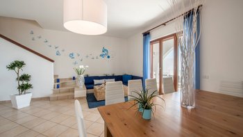 Das Innere der Villa ist kühl und komfortabel. Der OFFENER GRUNDRISS Wohnbereich ist in neutralen Farbtönen mit geschmackvollem Dekor in Blautönen gehalten, um die Umgebung der Villa zu betonen. Es gibt ein bequemes Sofa und einen großen Fernseher mit Sky sowie einen voll ausgestatteten Küchenbereich. Ein separates Esszimmer bietet den Gästen die Möglichkeit, insgesamt drinnen zu speisen. Aller vier komfortablen Schlafzimmer rund um die Villa verfügen über einen eigenen Blick auf Sorrent. Dessen separate Nebengebäude bietet eine zusätzliche kleine Küche, eine Frühstücksbar, einen Wohnbereich und ein Schlafzimmer mit eigenem Bad mit Balkon.