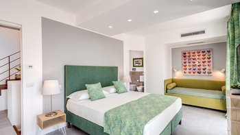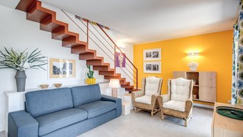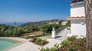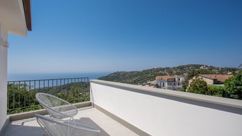 Im Inneren der Villa befindet sich ein heller, offener Wohn-/Küchenbereich, der sich perfekt zum Beisammensein eignet und hausgemachte Mahlzeiten genießt. Ein angrenzendes Schlafzimmer, das von der Terrasse aus zugänglich ist, verfügt über ein privates Schlafzimmer mit Doppelbett und eigenem Bad mit Dusche und Terrasse, von wo aus Sie einen Panoramablick auf das Meer genießen können. Auf der zweiten Etage befindet sich ein zusätzliches Schlafzimmer mit Doppelbett und eigenem Bad mit Dusche und Terrasse, das einen ruhigen Rückzugsort zum Entspannen bietet.