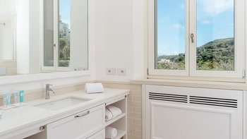 The principal suite features a king-size bed, an elegant en suite bathroom with bathtub, a discreet workspace and a large private balcony overlooking the water. A second master bedroom is equally impressive, with a king-size bed, shower room and balcony, complemented by a striking freestanding bathtub set beside a curved glass wall to fully appreciate the view. Two further bedrooms enjoy sea or garden outlooks, while a fifth king-size bedroom on the lower level offers added privacy, complete with a shower room and kitchenette. An additional bedroom and two further shower rooms complete the accommodation.