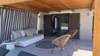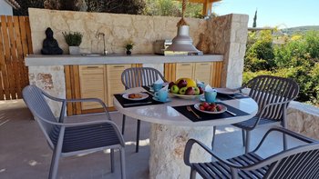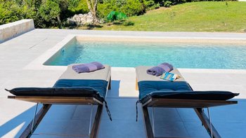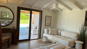 Der Außenbereich ist für Entspannung und Unterhaltung konzipiert. Deren Terrasse verfügt über einen PRIVATER POOL, Liegestühle, einen schattigen Essbereich und einen Grill mit Außenküche, ideal für ein gemütliches Mittagessen oder ruhige Abende unter dem Sternenhimmel. Eine ruhige Yoga-Terrasse bietet einen speziellen Ort zum Strecken, Meditieren oder einfach nur zum Aufsaugen der umliegenden Schönheit. Üppige Landschaften und sorgfältig gepflegte Gärten verstärken das Gefühl von Privatsphäre und Abgeschiedenheit.