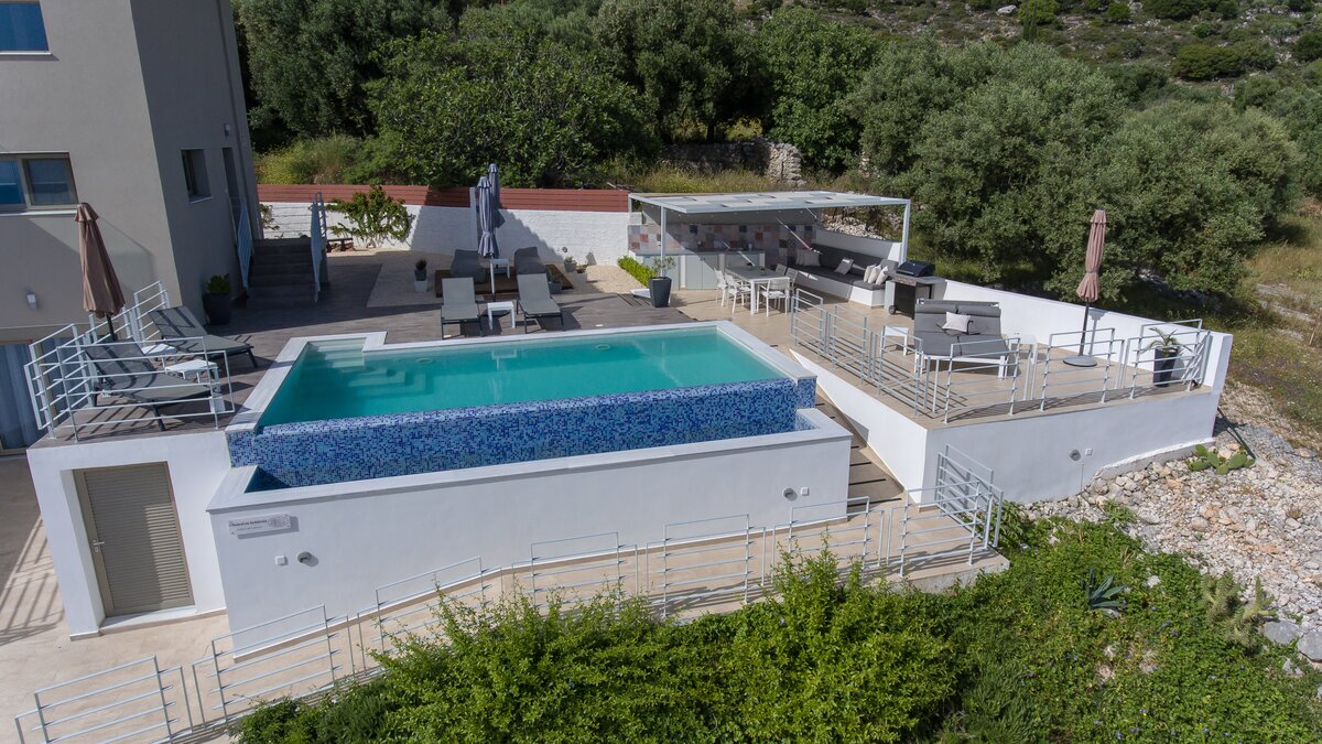 Die Villa Chara erstreckt sich über drei Etagen und verbindet modernes Design mit herzlicher griechischer Gastfreundschaft. Der geräumige offene Wohnbereich im Erdgeschoss verfügt über eine voll ausgestattete Küche mit einer Frühstückstheke, die sich auf eine überdachte Terrasse öffnet, auf der Sie Ihre Mahlzeiten im Freien genießen können, während Sie den herrlichen Blick auf das Ionische Meer genießen. Zwei helle und luftige Wohnbereiche bieten bequeme Orte zum Entspannen, während jedes der vier Schlafzimmer durchdacht gestaltet ist, mit eigenem Bad und Zugang zu privaten Terrassen, von denen die Gäste die idyllische umliegende Landschaft bewundern können.