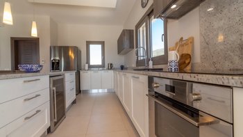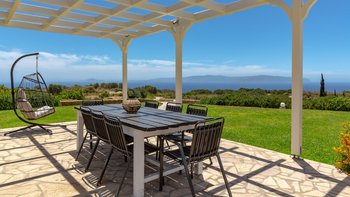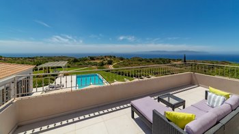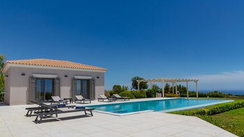 Bei der Ankunft werden die Gäste von üppig angelegten Gärten und einem großen Privatparkplatz begrüßt. Betreten Sie den Innenraum und entdecken Sie das helle, geräumige Interieur, in dem große Fenster und Glasschiebetüren die Wohnräume mit Tageslicht durchfluten und einen weiten Blick auf das Ionische Meer und die umliegende Landschaft bieten. Der offene Wohn- und Essbereich ist geschmackvoll eingerichtet mit bequemen Sofas und einem Esstisch für acht Personen, die einen einladenden Ort zum Entspannen und Unterhalten schaffen. Deren angrenzende Küche ist komplett mit modernen Geräten ausgestattet und eignet sich perfekt für die Zubereitung von Mahlzeiten für Mahlzeiten im Freien.