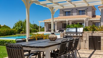 Auch die Außenbereiche der Villa sind beeindruckend. Ein großer privater Swimmingpool befindet sich im Herzen des Gartens, umgeben von Liegestühlen, Sonnenschirmen und schattigen Sitzbereichen – ideal, um mit einem Buch zu entspannen oder die Sonne zu genießen. Dessen überdachte Veranda bietet einen stilvollen Essbereich im Freien mit Grill, ideal für entspannte Mahlzeiten mit Familie und Freunden, während Sie den Sonnenuntergang beobachten. Kinder haben viel Platz, um auf der Liegewiese zu spielen, und die gepflegten Gärten bieten eine ruhige Umgebung für einen morgendlichen Kaffee oder einen Drink am Abend.