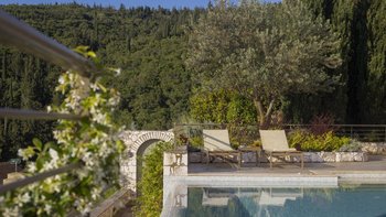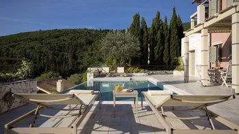 Yolanda genießt eine erstklassige Lage am Stadtrand von Fiscardo, mit herrlichem Blick über den Hafen in Richtung Ithaka und nur 150 m von den herrlichen Restaurants, Geschäften und Cafés am Wasser von Fiscardo entfernt. Yolanda ist traditionell und einfach im Stil, aber der Panoramablick von der Infinity-Poolterrasse über die Bucht von Fiscardo ist unvergesslich. Eine ideale Aufteilung für zwei Paare oder eine Familie, ein Zweibett- und ein Hauptschlafzimmer befinden sich im ersten Stock, beide mit Dusche en suite und eigenem Balkon. Im Erdgeschoss befindet sich eine offene Grundriss Küche, ein Wohnzimmer und ein Essbereich mit Zugang zur Poolterrasse mit Esstisch im Freien, und ein separates Duschbad ist ideal für die Nachschwimmduschen. In dieser Villa gibt es keine Notwendigkeit für ein Auto zu mieten, da es zahlreiche Restaurants in Fiscardo und Emblisi Strand und Foki Strand sind weniger als 2 km vom Haus entfernt. Yolanda teilt sich das Anwesen mit seinen Schwestervillen Delia und Lyra, die für größere Gruppen zusammen gebucht werden können.