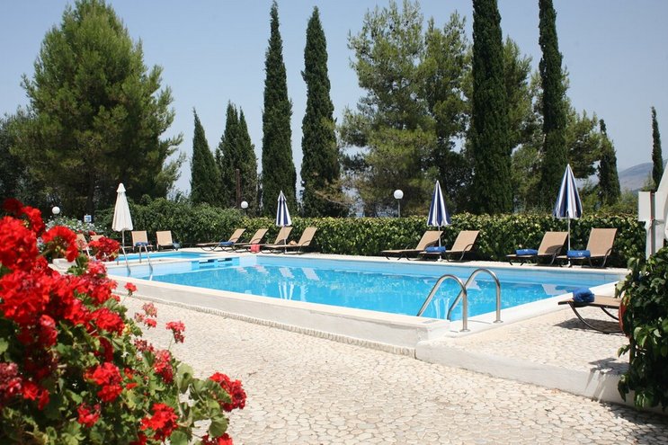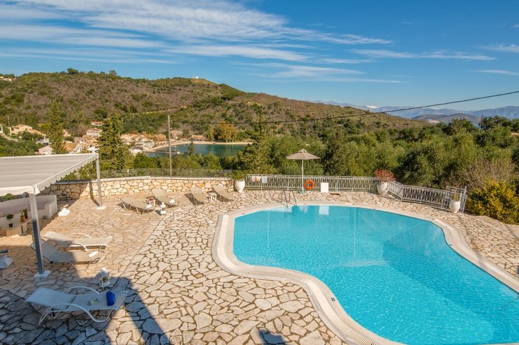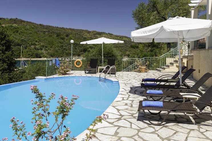 Dieses Familienapartment auf Korfu mit Blick auf den Pool, mit verlockendem Blick auf die Bucht zwischen den Bäumen, ist Teil der freundlichen und gut gelegenen Villa Kasomitria.