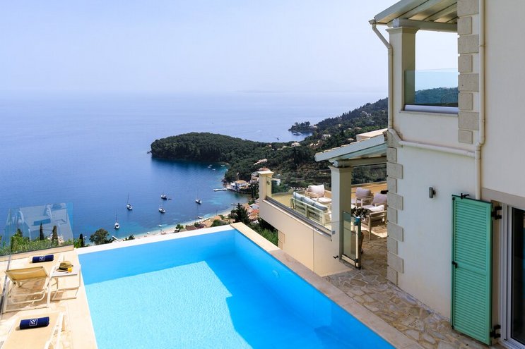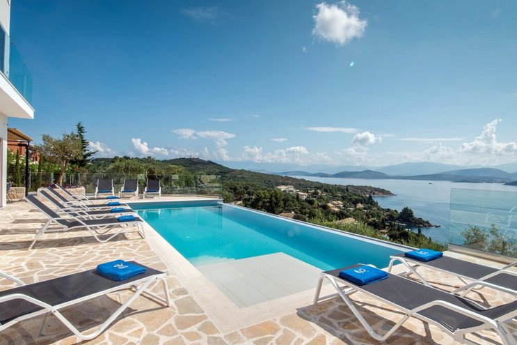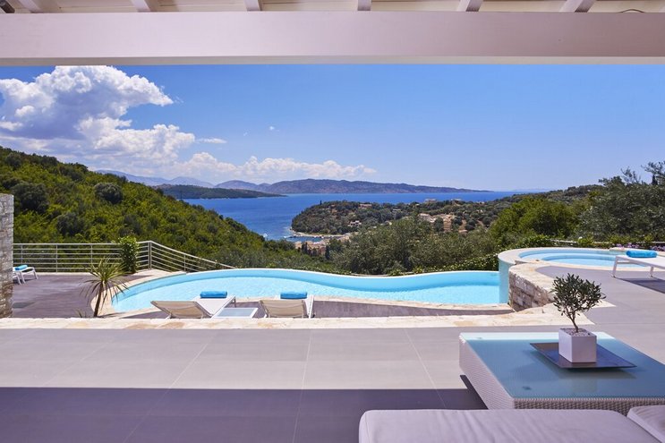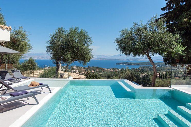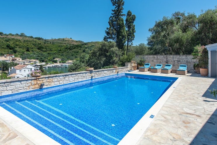 Mit herrlichem Blick auf die Hügel und den Hafen darunter, ist dies eine moderne und stilvolle Luxusvilla auf Korfu, gut gelegen für mehrere Strände und Buchten, und inklusive Kochservice für mühelose Freizeit.