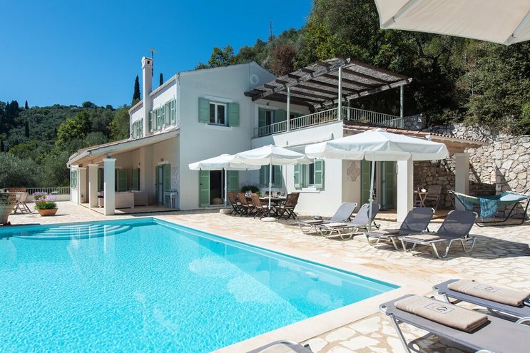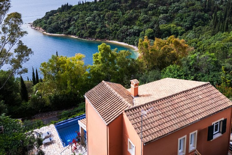 An einem absolut idyllischen Ort an der Nordostküste der Insel liegt diese Familienvilla auf Korfu direkt über einer verschlafenen Bucht und bietet von der Poolterrasse und den Balkonen eine außergewöhnliche Aussicht.