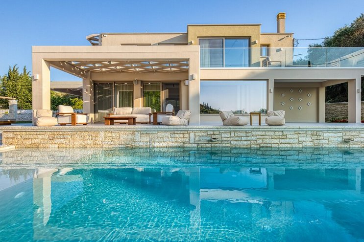 Eine idyllische kleine Enklave, mit inspirierendem Blick auf die umliegenden Hügel, Küstenbuchten und Albaniens Berge, ist dies eine sehr moderne Luxusvilla auf Korfu, wo Ruhe fast greifbar ist.