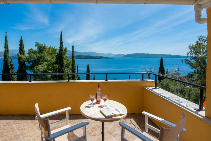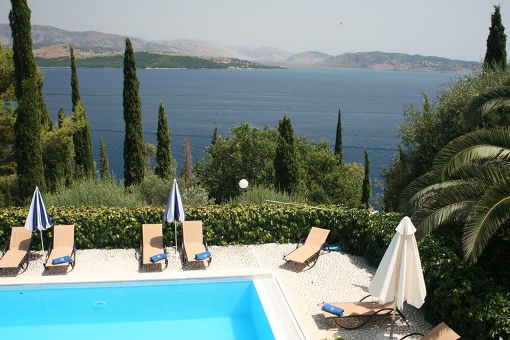 Die Villa Lefkothea liegt auf einem Hügel zwischen zwei Buchten und bietet Panoramablick auf die Stadt Korfu, das Ionische Meer und die Berge Albaniens.