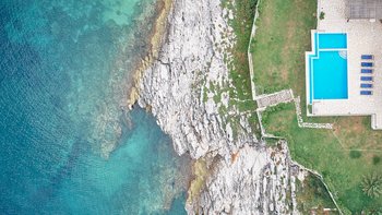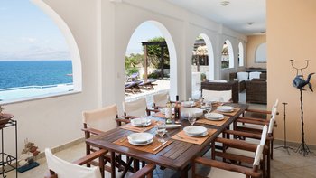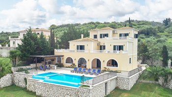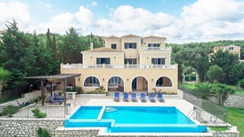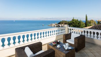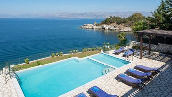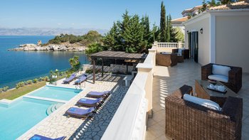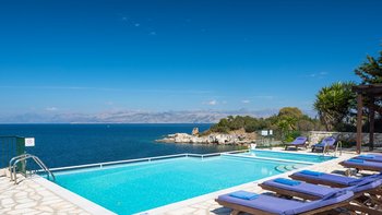 Diese Familienvilla auf Korfu liegt direkt an der felsigen Küste und bietet geräumige Terrassen, von denen Sie die herrliche Aussicht genießen können. Sie ist nur einen kurzen Spaziergang von einer Reihe von Stränden und Kassiopis Geschäften und Cafés entfernt.