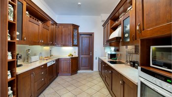 Zugang zur Villa durch Schlafzimmer, Pool nur über Treppen erreichbar.