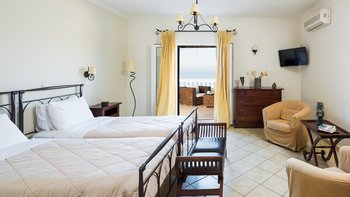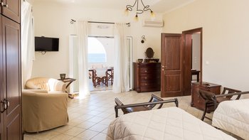 Mit Felsenbaden im wahrsten Sinne des Wortes „vor der Haustür“ und den schönen Stränden von Kanoni und Bataria, die nur fünf Minuten zu Fuß entfernt sind, verfügt diese sehr komfortable Familienvilla über eine beneidenswerte Lage und macht das Beste daraus mit Terrassen und Veranden auf drei Ebenen. Aller bieten einen fantastischen Blick über die Bucht bis hin zu Albaniens Küstengebirge und sind so eingerichtet, dass sie einen weitläufigen Wohnraum im Freien bilden. Im Erdgeschoss, nur ein paar Meter über dem Meer, wird ein schöner Swimmingpool durch ein großzügiges Kinderbecken verbunden und von der Haupt-Sitz- / Essveranda aus überblickt, wo große Bögen die Aussicht rahmen. Deren sonnige obere Terrasse wird von zwei großen Schlafzimmern geteilt, und das Doppelzimmer in der obersten Etage verfügt über einen eigenen Balkon. Jedes der vier Schlafzimmer verfügt über einen Fernseher und eine Klimaanlageund Das Haus verfügt über ein Spielzimmer und ein offenes Wohn-/Esszimmer. Der Aktea liegt auf der Landzunge, die von den Festungsruinen von Kassiopi gekrönt wird, und ist nur einen kurzen Spaziergang entlang einer ziemlich ruhigen Straße von den Annehmlichkeiten und dem Nachtleben des Resorts entfernt, was es zu einer besonders beliebten Wahl für Familien mit Teenagern macht.