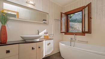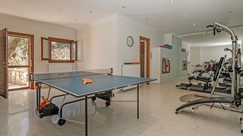 Diese Luxusvilla ist eine hervorragende Wahl für Gruppen von Freunden oder besondere Familienfeiern. Sie ist wunderbar geräumig und gut ausgestattet, sowohl innerhalb ihrer wunderschön eingerichteten Innenräume und auch außerhalb ihres herrlich abgeschiedenen Grundstücks. Sowohl das Haus und auch seine Gärten erstrecken sich auf mehrere Ebenen und bieten einen hypnotischen Blick auf die Bucht und die hitzeverhangenen Berge. Im unteren Erdgeschoss befinden sich die Hauptküche, ein großer Aufenthaltsraum mit TV, Billardtisch und Sofas und ein Fitnessraum und eine Sauna. Im oberen Stockwerk befindet sich das elegante Wohn-/Esszimmer mit einer zusätzlichen Küche, und im oberen OBERSTE ETAGE befindet sich ein Arbeitsbereich.