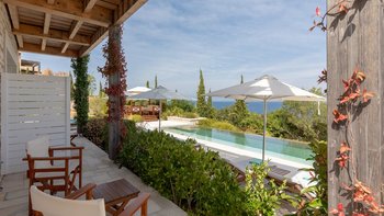 Der Wohnbereich im Freien ist der Ort, an dem Antheia wirklich zum Leben erwacht. Eine wunderschöne Terrasse verfügt über einen beeindruckenden 17 m langen Pool mit bequemen Holzliegen und einer erhöhten Pergola, die Schatten spendet, um darunter zu entspannen.