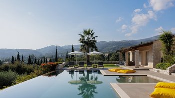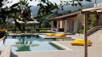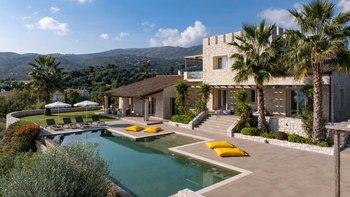 Diese moderne Steinvilla verfügt über einen beeindruckenden Infinity-Pool und allen Komfort, damit sich jeder entspannen kann.