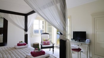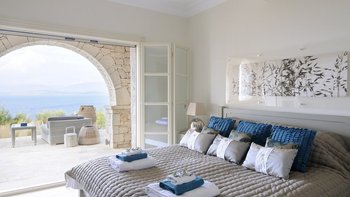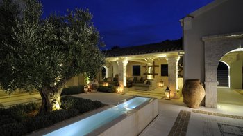 Diese luxuriöse Villa wurde hervorragend entworfen, um traditionelle korfiotische Elemente, venezianische Einflüsse der Insel und Komfort des 21. Jahrhunderts zu integrieren. Sie verfügt über geräumige Wohnbereiche auf mehreren Ebenen, drinnen und draußen, die alle von einem Gefühl von Romantik, Charakter und Stil berührt sind. Italienische Steinsäulen und Torbögen verbinden schicke Wohn- und Esszimmer mit ihren riesigen und eleganten Gegenstücken im Freien. Zwei alte Olivenbäume bilden das Herzstück eines wunderschön geformten Innenhofs, der mit einem aufwendig geschnitzten Tagesbett ausgestattet ist und vom Duft von Lavendel und dem Rinnsel des Wassers aus einer riesigen Muschel beruhigt wird.