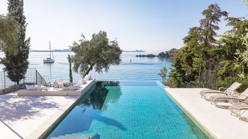 An der Spitze der Halbinsel Kommeno gelegen, bietet diese außergewöhnliche Villa direkt am Wasser einen hervorragenden Meerblick und viel Privatsphäre.