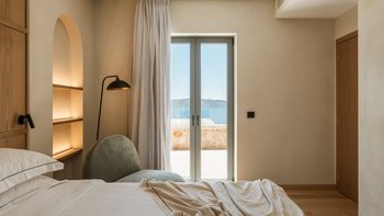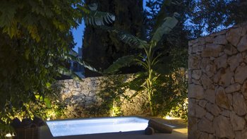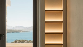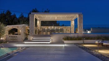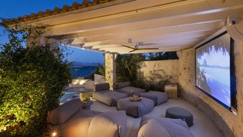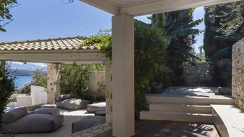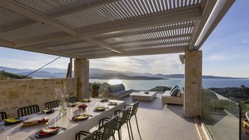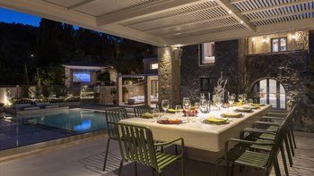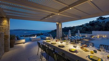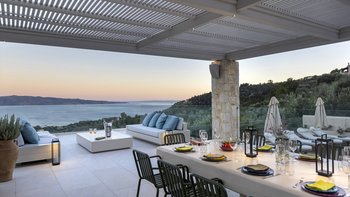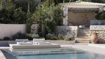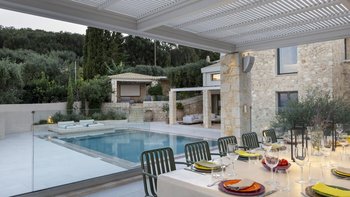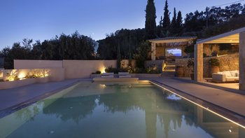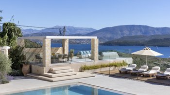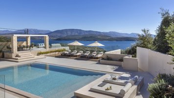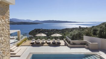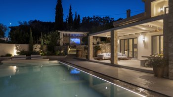 Mit herrlichem Blick auf die Hügel und den Hafen darunter, ist dies eine moderne und stilvolle Luxusvilla auf Korfu, gut gelegen für mehrere Strände und Buchten, und inklusive Kochservice für mühelose Freizeit.