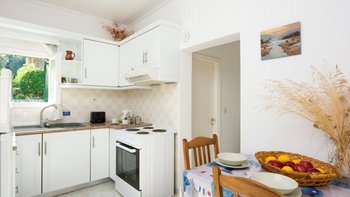 Villen für zwei Personen sind normalerweise komfortabel, meist attraktiv, manchmal gut gelegen für einen Strand und Restaurants und gelegentlich sogar mit eigenem Pool oder Garten. Dieser entzückende kleine Häuschen erfüllt all diese Anforderungen. Sein kompaktes, aber fröhliches Interieur ist perfekt proportioniert, mit einer angenehmen Küche/Esszimmer und einem klimatisierten Zweibett-Schlafzimmer, das sich auf eine schattige Veranda mit gepolsterten Stockstühlen öffnet. Draußen schmiegt sich das hübsche, farbenfrohe Haus in einen eigenen ummauerten Garten mit Töpfen, Pflanzgefäßen und blühenden Sträuchern, viel Platz zum Entspannen oder Essen und einem privaten, acht Meter langen Swimmingpool, der auf einer sonnigen Steinterrasse liegt. Dessen ist also nur noch weg, und Eleni’s ist eine beneidenswerte Lage. Am Rande des Dorfes gelegen, ist es nur ein paar Minuten vom lebhaften kleinen Hafen und fünf Minuten zu Fuß vom künstlichen Strand von St. Stephano entfernt, mit einfachem Zugang zu mehreren Resorts entlang der malerischen Küste. Deren Schwestervilla, Margarita, ist ein Nachbar und kann bei Eleni für Familien oder Freunde gebucht werden.