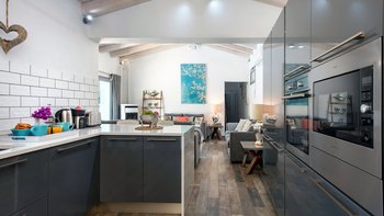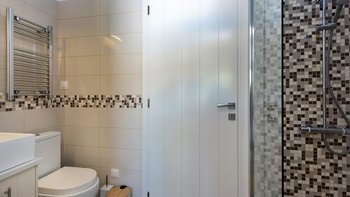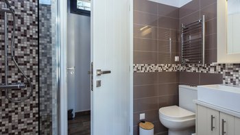 Das Erdgeschoss empfängt Sie in einer geräumigen, offenen Küche und einem Wohnbereich, der mühelos auf eine überdachte Terrasse und einen Essbereich übergeht, der sich perfekt für Mahlzeiten im Freien mit Aussicht eignet. Dessen Hauptschlafzimmer mit eigenem Bad öffnet sich ebenfalls auf die Terrasse und bietet einen ruhigen Rückzugsort nur wenige Schritte vom Wasser entfernt.