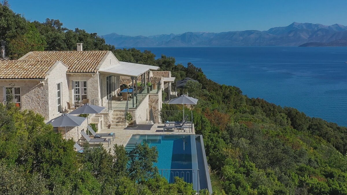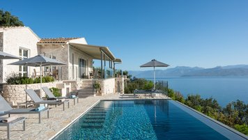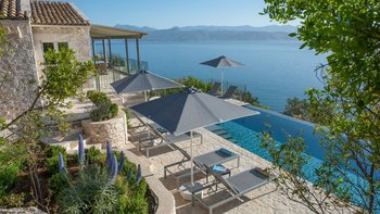 Seine unschlagbare Lage ist nur einer von vielen Gründen, warum wir Gaia lieben; nur 5 Minuten Autofahrt vom breiten Sandstrand von Kalamaki und nur 10 Minuten von einer wunderbaren Auswahl an Restaurants und Bootsverleih entfernt. Ununterbrochene Ausblicke führen einen üppigen grünen Hügel hinunter direkt zum Meer und weiter zu den majestätischen Bergen Albaniens. Einer der schönsten Orte, um die Aussicht zu genießen, ist sicherlich die Poolterrasse, wo der Infinity-Poolrand scheinbar mit dem Meer und dem Himmel verschmilzt. Dessen Terrasse erweitert die Länge des Hauses mit einem Bereich zum Essen im Schatten und einem separaten Bereich zum Entspannen im Freien mit bequemen Rattansitzen – perfekt, um sich mit einem guten Buch oder einem Sundowner zusammenzurollen.