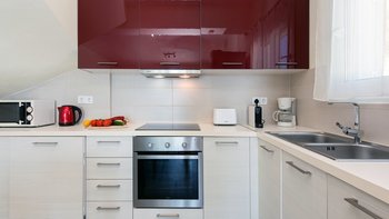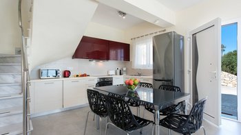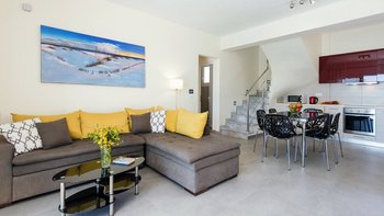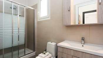 Der Innenraum der Villa ist schlicht und in einer neutralen Farbpalette mit farbigen Akzenten in den weichen Möbeln eingerichtet. Im Erdgeschoss befindet sich ein OFFENER GRUNDRISS Wohn- und Essbereich mit Frühstückstisch und Küchenecke sowie einem bequemen Ecksofa und einem Flatscreen-TV. Ein Schlafzimmer mit Doppelbett und angrenzendem Duschbad vervollständigt diese Etage. Im Obergeschoss befinden sich zwei weitere Schlafzimmer, von denen beide Zweibettzimmer sind, eines mit Dusche en suite und das andere mit Bad en suite und Zugang zu einem gemeinsamen Balkon.