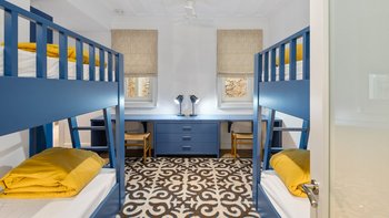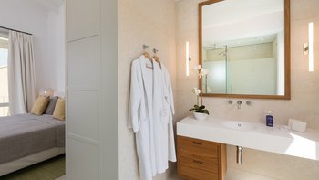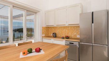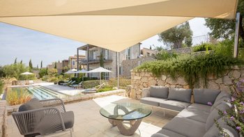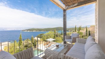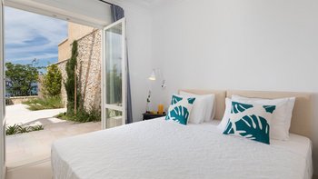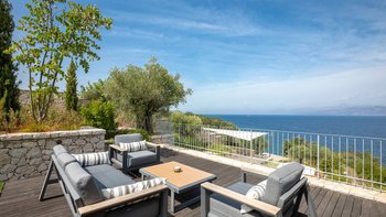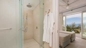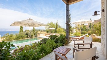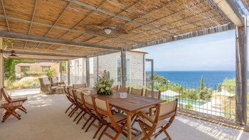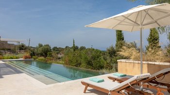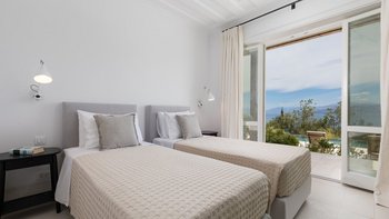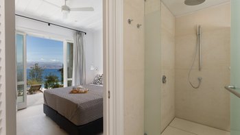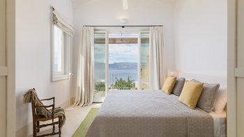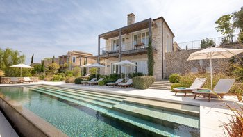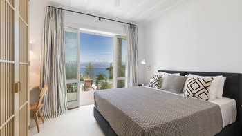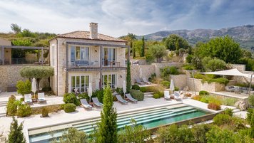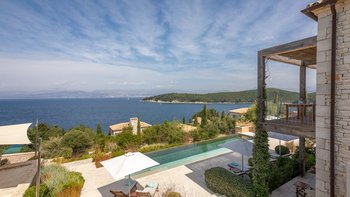Chic, modern und anspruchsvoll, Kalliopi ist eine willkommene Ergänzung unserer ABOVE-Kollektion auf Korfu. Im Inneren ist die Villa kühl und modern mit sauberen weißen Wänden und raumhohen Fenstern, die das Sonnenlicht und die umliegende Aussicht willkommen heißen. Dessen Erdgeschoss ist hell und geräumig mit einem OFFENER GRUNDRISS Wohn- und Essbereich und einer voll ausgestatteten Kochküche; Ein Fernsehraum ermöglicht es den Gästen, drinnen zu entspannen und zu entspannen. Es gibt vier Schlafzimmer im Erdgeschoss, die alle en suite sind und drei von vier zur Poolterrasse; Ein Etagenschlafzimmer ist ideal für Jugendliche. Deren erste Etage ist dem Hauptschlafzimmer gewidmet, mit einem Badezimmer en suite und einem privaten Innenhof mit einer freistehenden Badewanne im Freien.