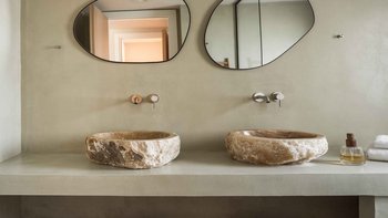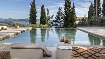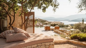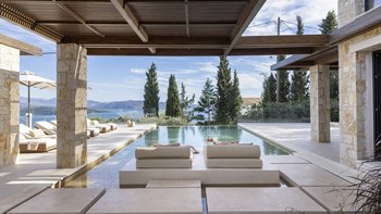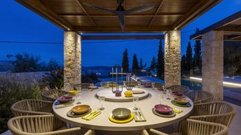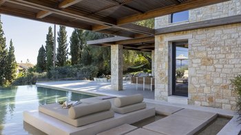 Eine Landstraße schlängelt sich hinunter in das hübsche kleine Hafendorf St. Stephano und führt einen Hang hinunter, der von einer Reihe gut gestalteter, moderner Villen übersät ist. Eine davon ist Nefeli, das größtenteils aus lokalem Stein erbaut wurde und von Gärten mit Rasen, Bäumen und aromatischen Sträuchern umgeben ist, wo ein acht Meter langer Infinity-Pool den Mittelpunkt der geräumigen möblierten Sonnenterrasse bildet. Des Lebens im Freien wird durch eine gepflasterte Gartenpergola mit Blick auf die Rasenflächen, überdachte Terrassen, die zum Entspannen und Essen eingerichtet sind, und schattige Räume gefördert, um den Hang hinunter zu den Yachten zu blicken, die in der Bucht vor Anker liegen.