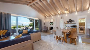 der rechten Seite des Grundstücks befindet sich ein herrlicher Essbereich im Freien und die Außen- und Außenküche, komplett ausgestattet mit Kühlschrank, Herd und Grill.Im Inneren ist die Villa hell und geräumig, mit hohen Holzbalkendecken mit weichen Kupferstrahlern und einem entspannten Strandstil, der überall präsent ist; fertig mit einem hervorragenden Standard, verbindet das Nero Beach House Komfort und Stil perfekt. Im Erdgeschoss befinden sich zwei Schlafzimmer mit Bad, ein großzügiger offener OFFENER GRUNDRISS und eine moderne Küche. Französische Fenster ermöglichen einen nahtlosen Zugang zu den großen Außenterrassen, die sich ungefähr in Drittel teilen, von denen alle eine unglaubliche Aussicht genießen. Im Obergeschoss befinden sich zwei weitere Schlafzimmer mit Bad, bestehend aus einem Zweibett- und einem Doppelschlafzimmer, die beide und Zugang zu einem Balkon haben; während sich im unteren Erdgeschoss weitere zwei Zweibett-Schlafzimmer mit Bad mit Dusche befinden.Alle Zweibett-Zimmer können als Doppelzimmer eingerichtet werden, was dies zu einem sehr flexiblen Haus für Gruppen macht.
