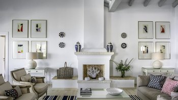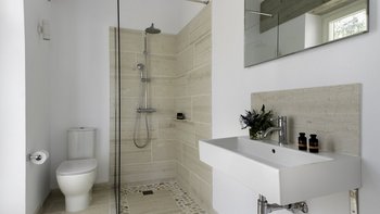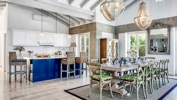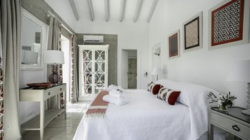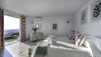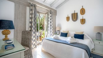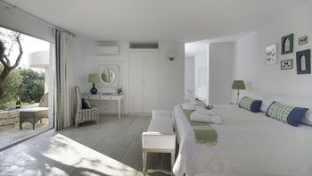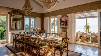 Der offene Grundriss Wohnbereich ist hell und luftig; Es gibt einen langen Esstisch mit Kandelaber und modernen Hängelampen, eine voll ausgestattete Küchenzeile mit Frühstückstheke und Hockern und einen bequemen Sitzbereich zum Entspannen im Innenbereich. Es gibt vier Doppelschlafzimmer im Erdgeschoss, jedes mit seinem eigenen, subtilen, aber stilvollen Dekor. Aller vier offen zur Terrasse und jedes hat ein Duschbad en suite. Im unteren Erdgeschoss befinden sich zwei weitere Doppelschlafzimmer en suite, die von außen zugänglich sind.