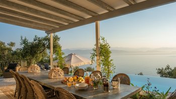 Olive Tree House bietet das Gute aus beiden Welten für Gäste, die einen wunderbar abgeschiedenen und luxuriösen Rückzugsort genießen und trotzdem nah am Geschehen sein möchten. Von seiner Hanglage aus hat man einen herrlichen Blick auf das Meer und die Berge Albaniens. Ein unwiderstehlicher nierenförmiger Pool verfügt über eine lange Infinity-Kante, wo er nahtlos mit dem Meer dahinter verschmilzt; Rattan-Liegen und Sonnenschirme säumen die gegenüberliegende Kante zum Sonnen und Stühlen auf der anderen Seite, ideal für Unterhaltung im Freien.