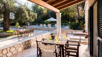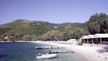 Perfekt gelegen und immer beliebt, führt in dieser Familienvilla auf Korfu ein Pergola-Schattenweg zum Gartentor, das sich direkt zum glitzernden Kieselstrand von Kerasia öffnet.