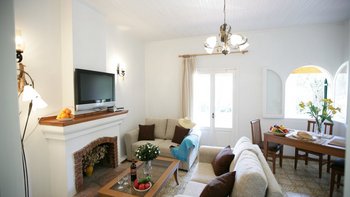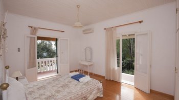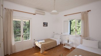 Dies ist eine Villa, die einen Hauch von zeitlosem Korfu bietet, wo herrliche Gärten am Meer für Privatsphäre abgeschirmt sind mit alten Bäumen, Blumen und blühenden Sträuchern bestreut und kreuz und quer von gepflasterten Wegen durchzogen sind, darunter ein mit Weinreben bedeckter Pergola-Bogen, der direkt zum Strand führt. Dessen zweistöckiges Haus hat farblich getünchte Wände, Fensterläden und zwei Wohnungen, eine auf jeder Etage. Auf dem ummauerten Grundstück befinden sich ruhige Ecken, schattige Rasenflächen, ein eingebauter Grill und ein 10-Meter-Pool auf einer sonnendurchfluteten Terrasse, alle von den Gästen der oberen und unteren Wohnungen genossen. Wenn also Sophia als Ganze gebucht wird, ist das Haus ideal für zwei Familien und bietet jedem ein gewisses Maß an Privatsphäre. Separat ist jedes Apartment in sich geschlossen, mit individuellem Zugang und Türen zum Außenbereich. Der Obere Apartment verfügt über Balkone, die mit aufkeimender Bougainvillea geflochten sind, ein Doppel- und Zweibettzimmer, jeweils mit Klimaanlage, und ein offen geschnittenes Wohn-/Esszimmer mit weißen Wänden, hellen Fliesenböden und Türen zum Balkon.