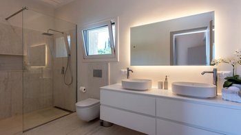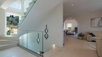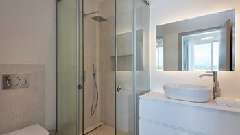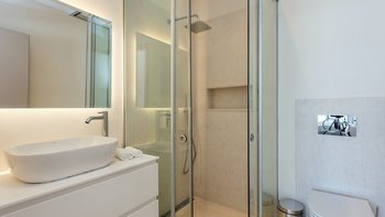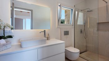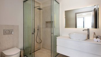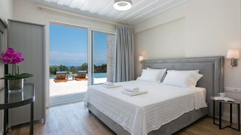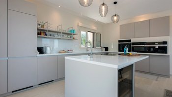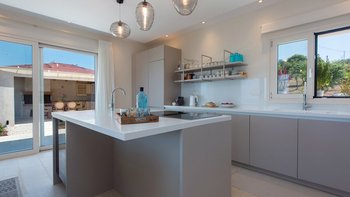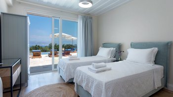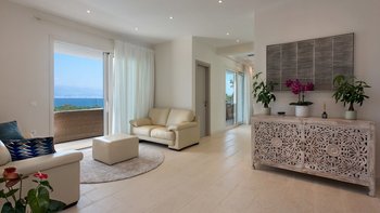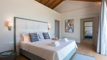 Jedes der sechs Schlafzimmer mit eigenem Bad öffnet sich entweder auf einen Balkon oder eine Terrasse, wodurch die erhöhte Lage und das natürliche Licht der Villa optimal genutzt werden. Deren Aufteilung ist ideal für Familien oder Gruppen, mit vier Doppelzimmern, darunter eine Master-Suite mit Kingsize-Bett, und zwei Zweibettzimmern. Eine offene, voll ausgestattete Küchenzeile geht in den Essbereich im Freien über und lädt die Gäste ein, entspannte Mahlzeiten im Freien zu genießen, die mit Leichtigkeit zubereitet werden.