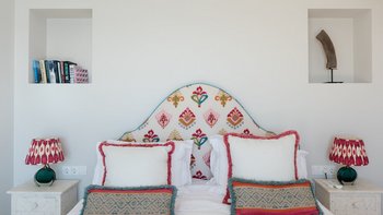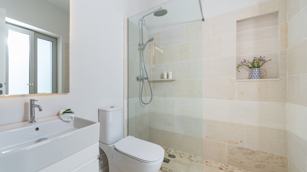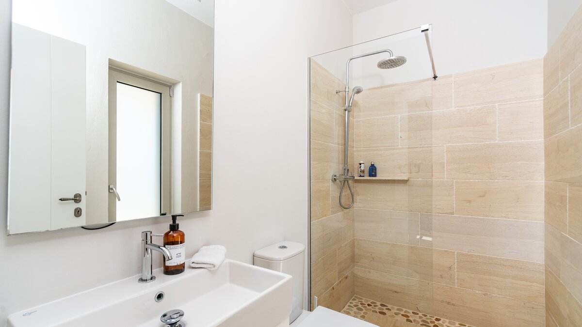 Auf der unteren Ebene, die von außen zugänglich ist, befinden sich drei weitere Schlafzimmer, von denen jedes über ein eigenes Bad mit Dusche verfügt, um ein Maximum an Privatsphäre und Komfort zu gewährleisten. Eines davon ist ein Schlafzimmer mit Doppelbett und eigener Terrasse, während die anderen beiden als Doppel- oder Zweibettzimmer eingerichtet werden können und somit flexibel für verschiedene Gruppenkonfigurationen sind. Aller Zimmer sind sorgfältig in einem modernen, schlichten Stil eingerichtet und verfügen über große Fenster oder Türen, die zu den Terrassen und Gärten führen, so dass die beruhigende Präsenz des Meeres nie weit entfernt ist.