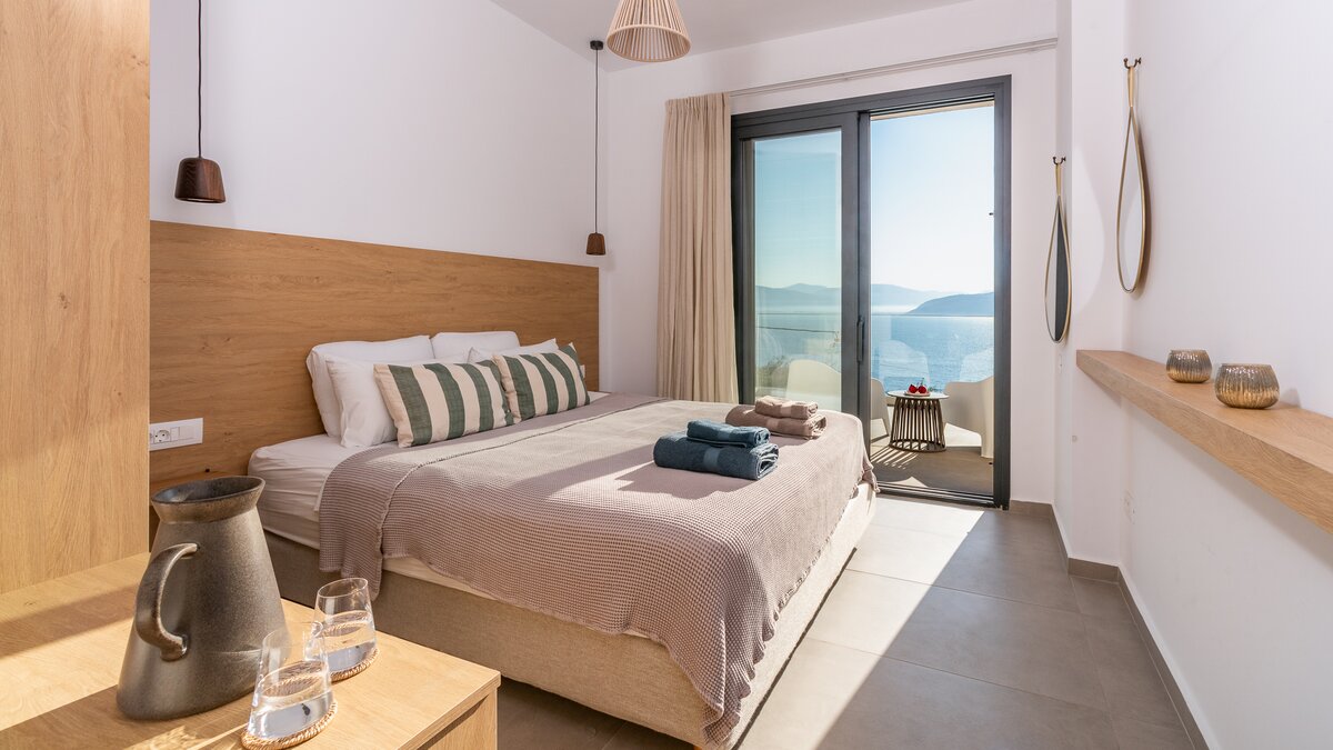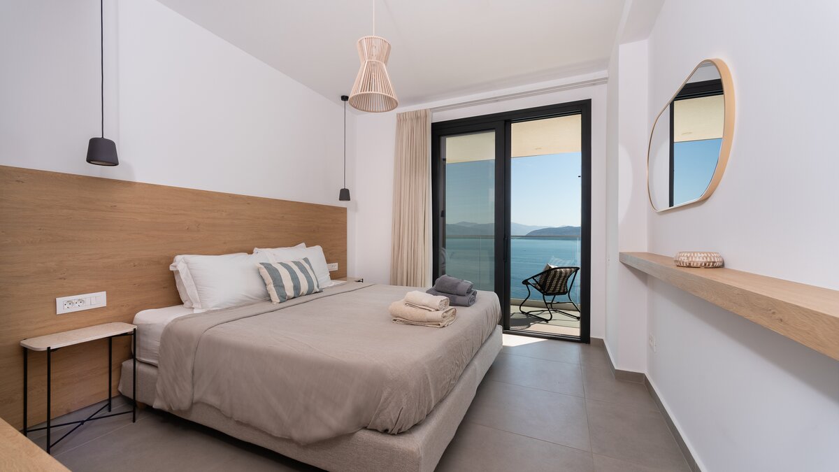 Die erste Etage hebt den Charme der Villa mit ihren intimen Räumen zur Entspannung hervor. Jedes Zimmer auf dieser Ebene verfügt über ein eigenes Bad, das in neutralen Farbtönen gehalten ist und eine ruhige Atmosphäre schafft. Die Innenräume sind von weißen Farbtönen mit subtilen Beige-Akzenten geprägt, die das ruhige Ambiente der Villa ergänzen. Alle Schlafzimmer öffnen sich zu einer Terrasse mit Blick auf das azurblaue Wasser und bieten den Gästen einen ungestörten Blick auf die natürliche Schönheit Korfus.