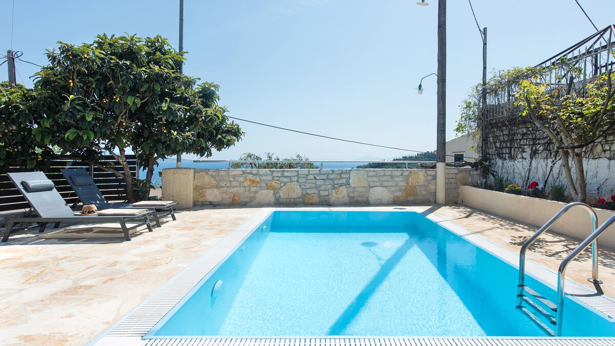 Im Freien lädt eine große, von Bäumen und Pergolen beschattete Terrasse zu gemütlichen Frühstücken oder abendlichen Drinks ein. Der Privater Pool mit Blick auf das Ionische Meer bietet einen erfrischenden Ort, um sich zu entspannen, während Sie die Aussicht genießen. Ein eingebauter Grill und mehrere Liegebereiche machen diesen Raum ideal für entspannte Tage und entspannte Abende unter dem Sternenhimmel.