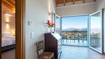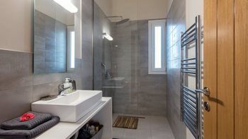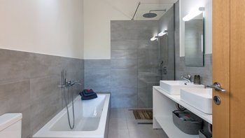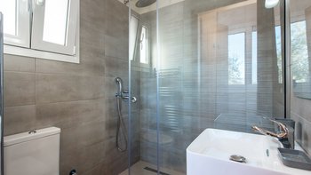 Im Obergeschoss befinden sich drei weitere Schlafzimmer, alle mit Zugang zu einem Balkon. Deren Hauptschlafzimmer verfügt über ein eigenes Bad mit Dusche. Denen anderen beiden Schlafzimmer teilen sich ein Duschbad und ein separates WC. Der Terrassenbereich im Obergeschoss bietet einen gemütlichen Sitzbereich, ein perfekter Ort, um den umliegenden Panoramablick zu genießen.