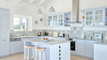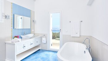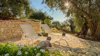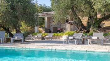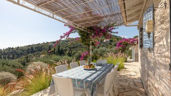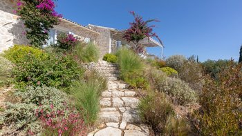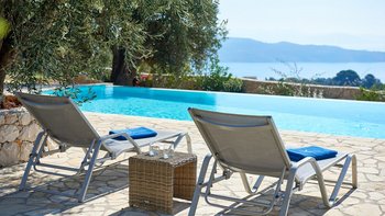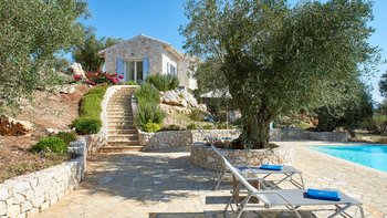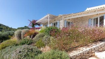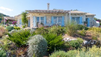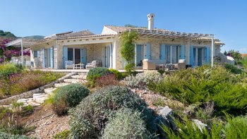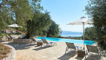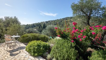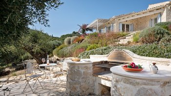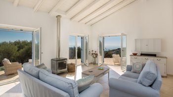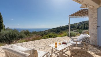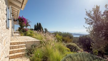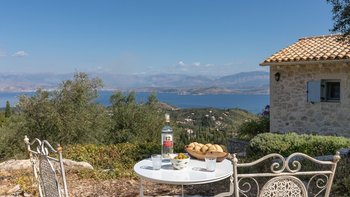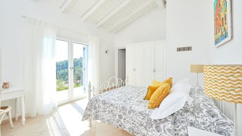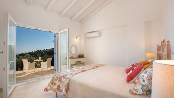 Das Hauptschlafzimmer mit Doppelbett verfügt über ein Bad en suite mit separater Innen- und Außendusche und einen eigenen Balkon. Ein weiteres Doppel- und zwei Zweibettschlafzimmer mit eigenem Duschbad vervollständigen die Residenz. Deren nächsten Kies- und Sandstrände sowie Sinies und die Festung Kassiopi sind nur eine kurze Autofahrt entfernt.