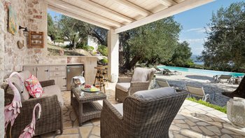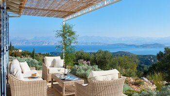 Mit Blick auf das Meer und in der Nähe von St. Stephano und Kassiopi ist das Yaneleni eine moderne Unterkunft, die zu einem ausgezeichneten Standard eingerichtet ist, mit hervorragendem Meerblick und viel Platz im Freien.