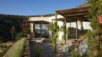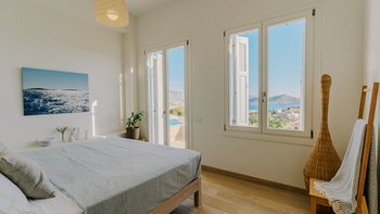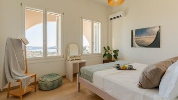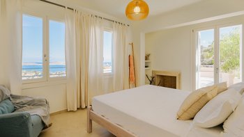Diese helle und luftige griechische Unterkunft bietet einen ruhigen und landschaftlich reizvollen Aufenthalt mit herrlichem Meerblick.