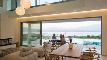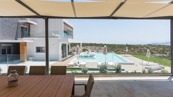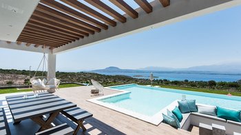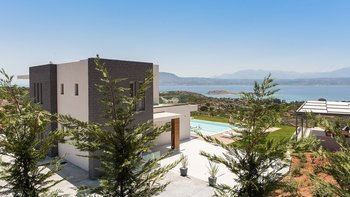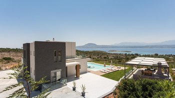 Die helle und geräumige Villa Alayla ist eine moderne und ruhige Unterkunft mit großen Gärten und weitem Meerblick.