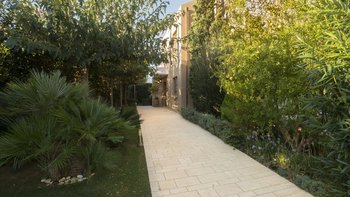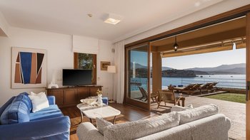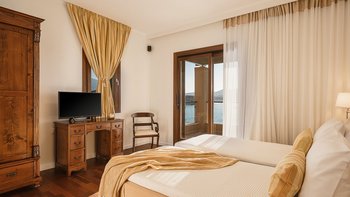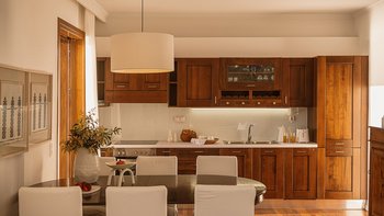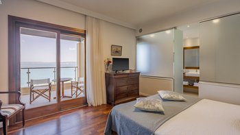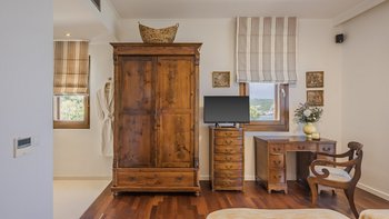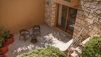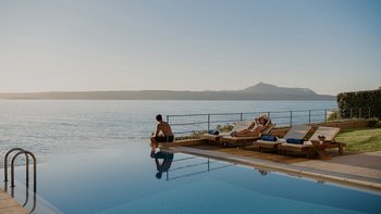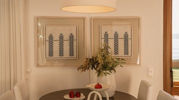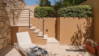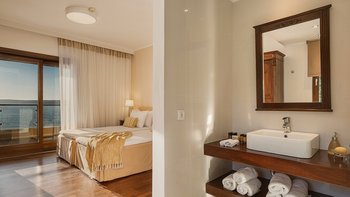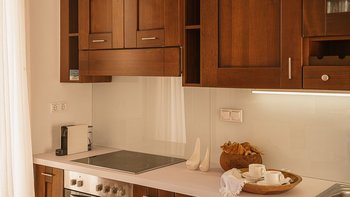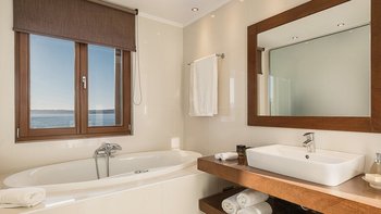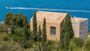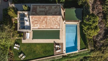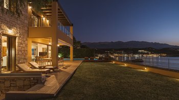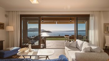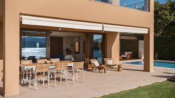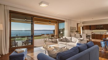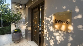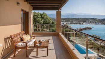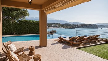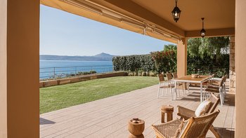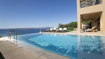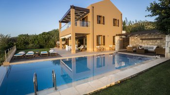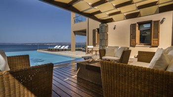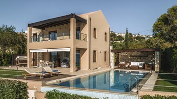 Die ansprechend in Sand-, Meer- und Sonnengoldtönen eingerichtete Villa Anemos ist eine von drei benachbarten Schwestervillen und ist in einer Mischung aus klassischer Eleganz und modernem Design eingerichtet, wobei die Ausstattung auf dem neuesten Stand der Technik ist. Innerhalb der klimatisierten Villa befindet sich ein sehr geräumiges Wohnzimmer im Erdgeschoss, dessen offene Anordnung von der Küche in die Ess- und Sitzbereiche fließt und sich durch hohe Schiebetüren auf eine überdachte Terrasse mit freiem Meerblick öffnet und.