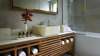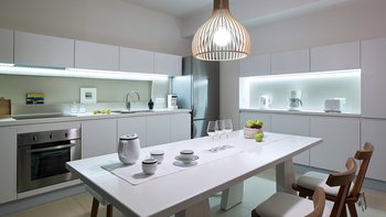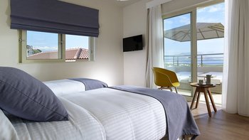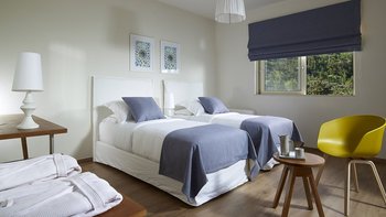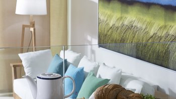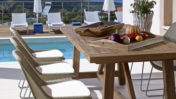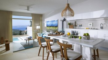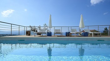 Das ruhige und aufgeräumte Design der Armonia verbindet gedämpfte, neutrale Töne mit Kunstwerken und Artefakten in brillantem Aqua, den klaren Linien einer glänzenden weißen Küche und einer Unmenge edler Teakholz-Möbel drinnen und draußen. Dessen luftiges Wohnzimmer öffnet sich durch eine ganze Fensterwand auf eine Holz-Sonnenterrasse neben dem privaten beheizten Pool, der einen flachen Bereich für Kinder hat und von einer geräumigen Essterrasse überblickt wird. Beiden bieten einen weiten Panoramablick über mehrere Dörfer bis hin zur malerischen Souda-Bucht, ebenso wie die drei Schlafzimmer der Villa, jedes mit eigenem möblierten Balkon, schickem Bad und/oder Dusche, WLAN und Satelliten-TV.
