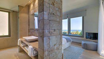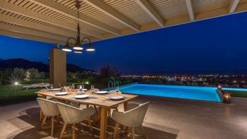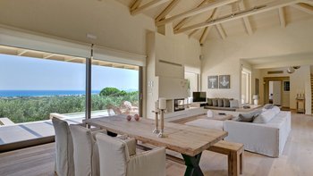 Stilvolles Design bringt kosmopolitischen Chic auf die Landschaft in dieser Luxusvilla mit zwei Pools, einem Fitnessraum und einem Weinkeller. Weit offener Blick auf das Meer und die Berge trägt zur inneren Gelassenheit bei.