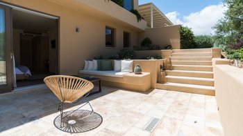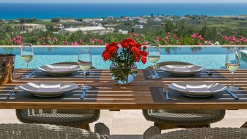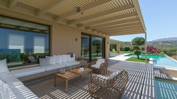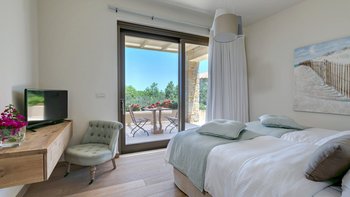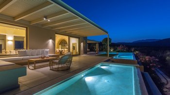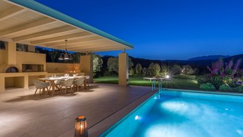 Die Liebe zum Detail ist allgegenwärtig in den vier Schlafzimmern mit jeweils eigenem Bad oder Dusche, möbliertem Balkon, Sat-TV, Coco-Mat-Matratzen und hochwertiger Bettwäsche und Pflegeprodukten zu spüren. Und draußen mit Nachtbeleuchtung gibt es überdachte Terrassen zum Essen und Entspannen, einen Gemüsegarten, eine Sommerküche mit Grill und Holzofen, einen Infinity-Pool und Liegewiese und einen Kinderpool und einen Spielbereich.