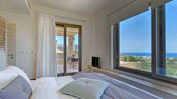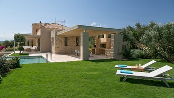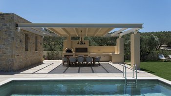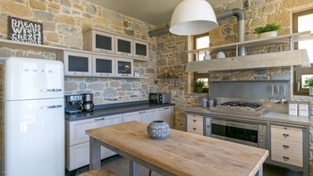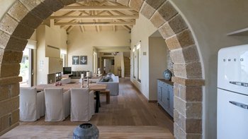 Aufgeräumt, dezent und schick, steht dieses sehr moderne Haus auf einem drei Hektar großen, geschlossenen Grundstück, nur 1,5 km von den Geschäften und Restaurants am Wasser im Dorf Kolymvari und 2 km vom langen Sand- und Kieselstrand entfernt. Dessen stilvolle Zimmer der Villa sind eine Oase der Ruhe und des Luxus und verfügen über Eichenböden, freiliegende Steinwände, hohe Sparrendecken und Dekor und Möbel in sanften Erdtönen. Zu den außergewöhnlichen Einrichtungen gehören ein heller und luftiger Fitnessraum und ein gewölbter Steinweinkeller mit griechischen und kretanischen Weinen. Der Wohnbereich ist ein schönes offenes Arrangement, in dem eine coole Retro-Küche, gut ausgestattet mit modernen Geräten, an ein ruhiges und geräumiges Wohn- / Esszimmer mit einer Fensterwand auf die herrliche Aussicht angrenzt.
