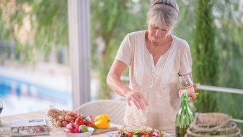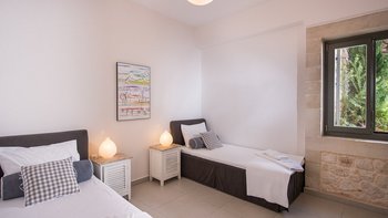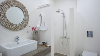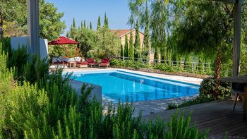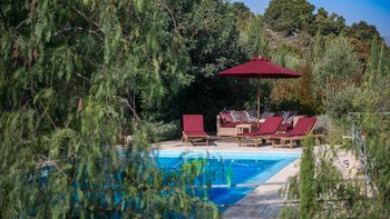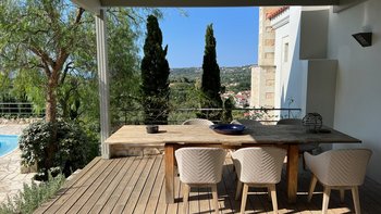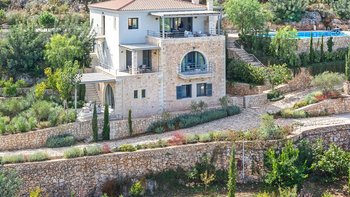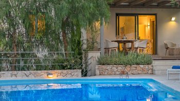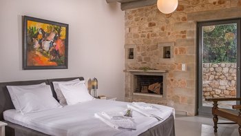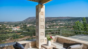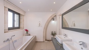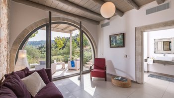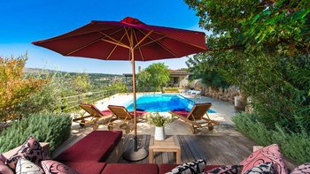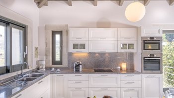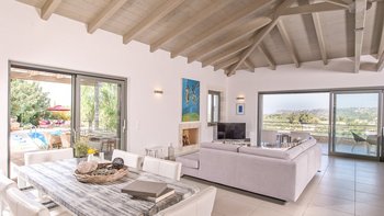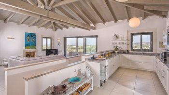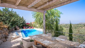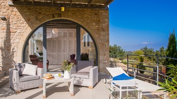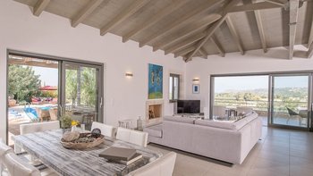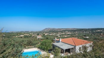 Jedes der drei Schlafzimmer verfügt über ein eigenes Bad mit Dusche, und auf der Eingangsebene, an der Spitze des Hauses, eine hohe Dachsparrendecke über einen luftigen Gesellschaftsraum mit einer eleganten weißen Küche, Ess- und Sitzbereiche und Zugang zu einer Essterrasse neben dem Pool. Deren Villa ist mit WLAN, Sat-TV und einer Fußbodenheizung / -kühlung ausgestattet und bietet einen Kochservice, um seine idyllische Gemütlichkeit zu verstärken. Mit einer Bäckerei und einfachen Tavernen im Dorf, die Strände von Kalyves und Almyrida sind nur 4-6 km Autofahrt entfernt.